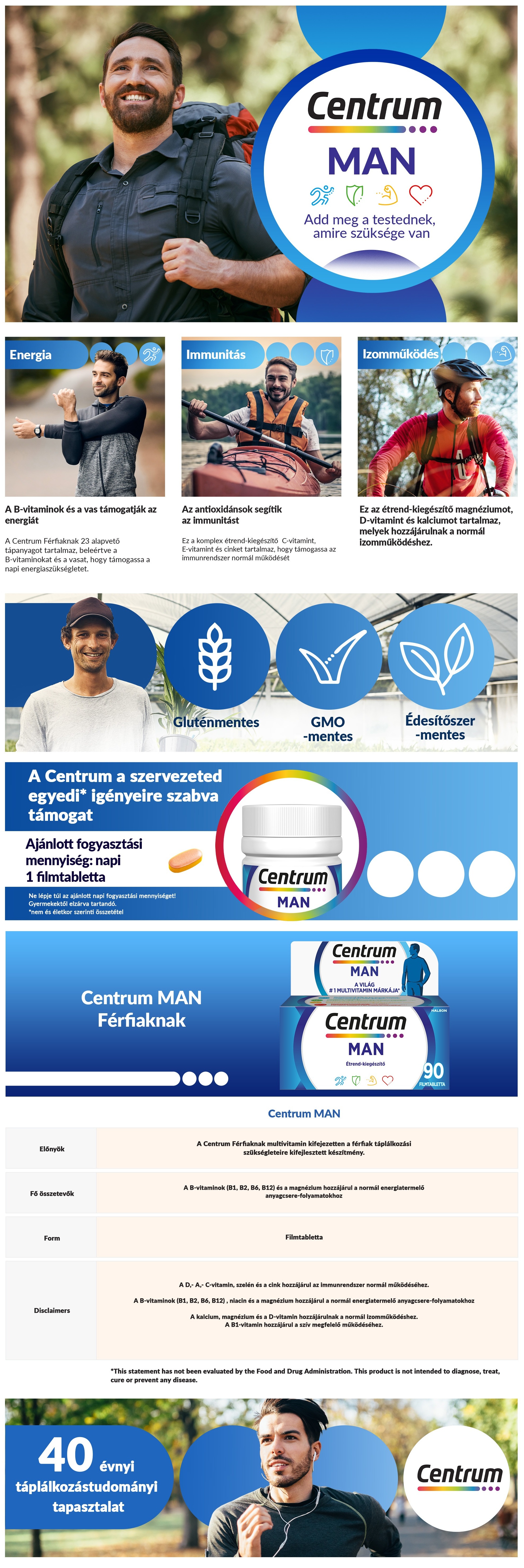 Centrum Férfiaknak A-tól Z-ig filmtabletta különlegesen kiegyensúlyozott formuláját a férfiak tápanyagszükségletére szabták, esszenciális mikrotápanyag (vitaminok, ásványi anyagok és nyomelemek) tartalmával hozzájárul tápanyagszükségletük fedezéséhez, kiváló minőségű étrend-kiegészítést kínálva számukra.
