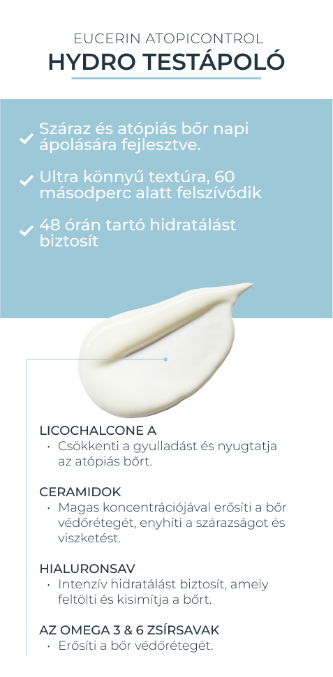 Az Eucerin AtopiControl Hydro testápoló egy innovatív, ultrakönnyű textúrájú hidratáló, amelyet kifejezetten az atópiás dermatitiszre hajlamos, érzékeny bőr mindennapi ápolására fejlesztettek. A formula gyorsan beszívódik, nem hagy zsíros érzetet, mégis intenzív, hosszan tartó nedvességet biztosít.