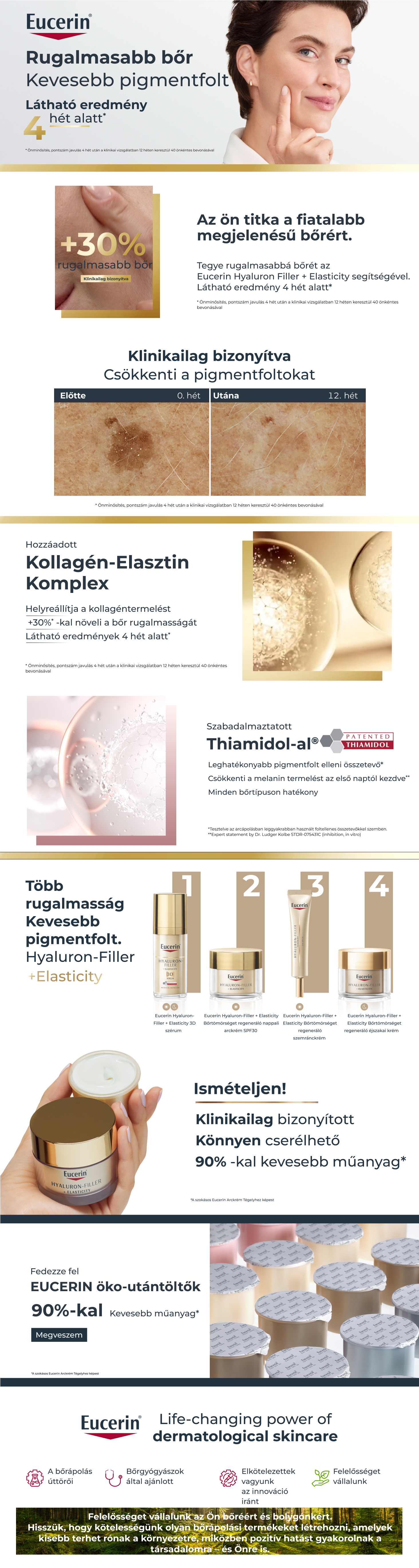 Az Eucerin Hyaluron-Filler + Elasticity Nappali Arckrém SPF30 öko utántöltője a fenntartható szépségápolás és a bőröregedés elleni célzott hatékonyság tökéletes ötvözete. A formula a jól ismert Hyaluron-Filler + Elasticity technológián alapul, amely fokozza a bőr feszességét, javítja a rugalmasságot, és csökkenti a mély ráncokat.