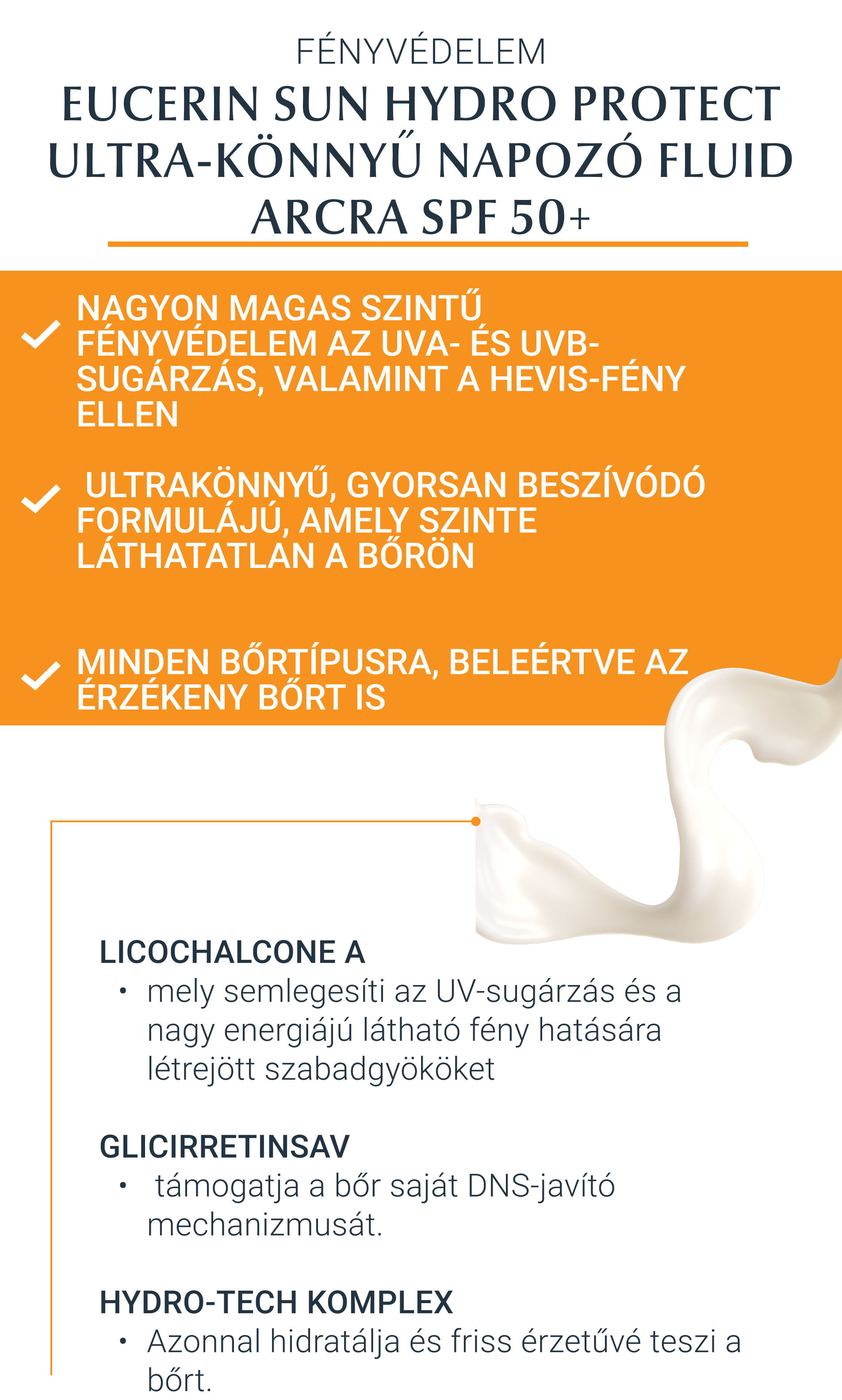 A Eucerin Sun Hydro Protect ultra-könnyű fluid SPF50+ ideális választás a normál, kombinált és érzékeny bőrűek számára, akik nemcsak erős UV-védelmet, de kellemesen könnyű, gyorsan beszívódó textúrát is keresnek. Innovatív formulája azonnal hidratál, mattít, és nem hagy zsíros, ragacsos érzetet.