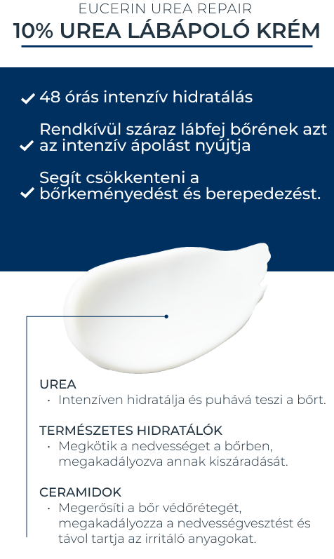 - 10% Urea (karbamid) – Természetes hidratáló komponens (NMF), amely mélyen a bőrbe hatol, vízmegkötő tulajdonságának köszönhetően csökkenti a hámlást és az érdes bőrfelszínt.