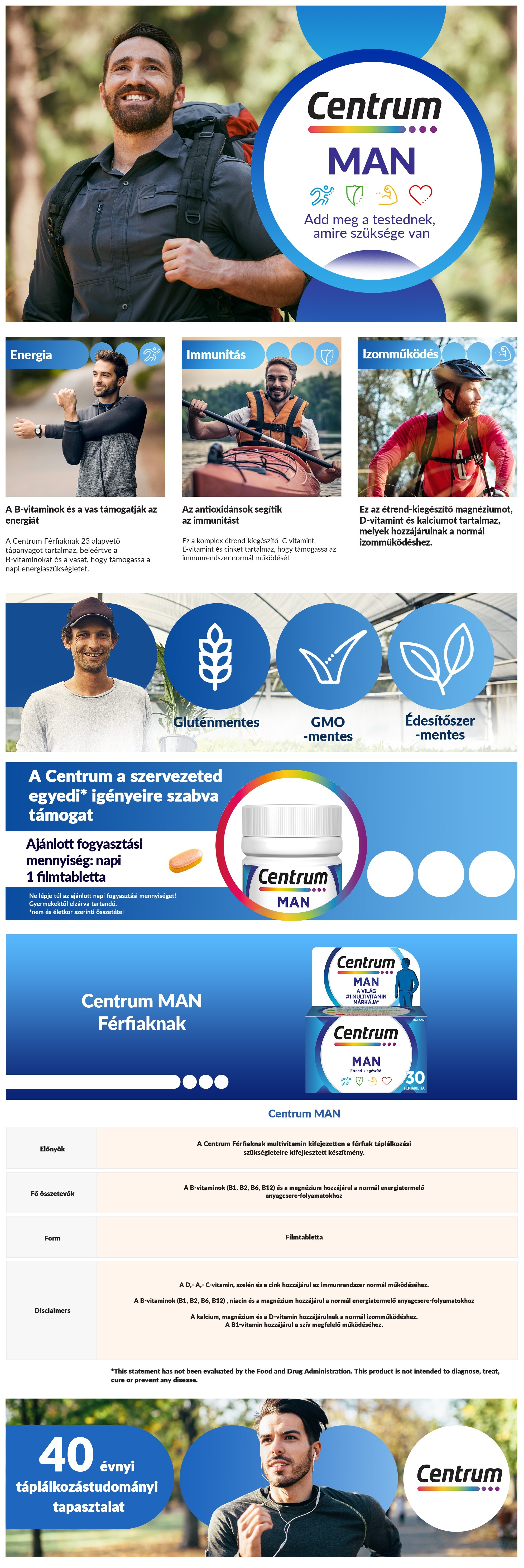Centrum Férfiaknak A-tól Z-ig filmtabletta különlegesen kiegyensúlyozott formuláját a férfiak tápanyagszükségletére szabták, esszenciális mikrotápanyag (vitaminok, ásványi anyagok és nyomelemek) tartalmával hozzájárul tápanyagszükségletük fedezéséhez, kiváló minőségű étrend-kiegészítést kínálva számukra.