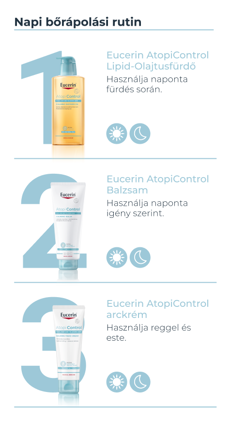 - Tisztítsd meg az arcot gyengéd arctisztítóval (pl. Eucerin AtopiControl tusfürdő)