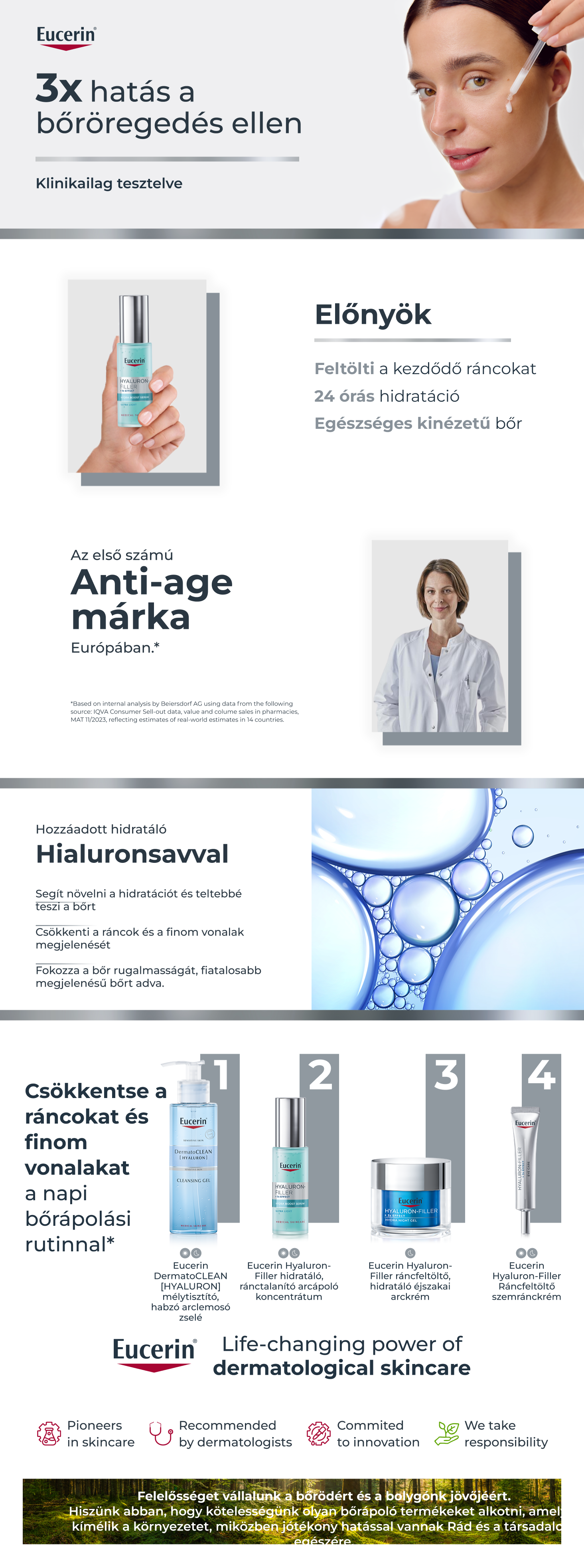 Az Eucerin Hyaluron-Filler termékcsalád hatékonyságát számos klinikai és bőrgyógyászati tanulmány igazolja. A koncentrátum rendszeres használata: